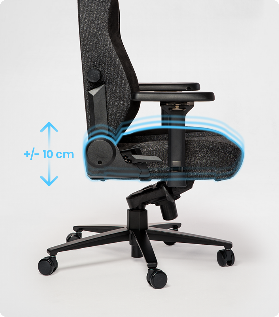 Tökéletesen illeszkedik a 165 és 185 cm közötti egyénekhez, teljesen állítható ülésünk egyedi illeszkedést biztosít. A fejlett pneumatikus mechanizmus könnyed magasságállítást tesz lehetővé: egyszerűen húzd meg a kart és emeld meg kissé az ülés emeléséhez, vagy nyomd le ülve az ülés leengedéséhez. Könnyedén elérheted az ideális ergonómikus pozíciót – a térdednek 90 fokos szöget kell alkotnia, és a könyöködnek kényelmesen kell pihennie 90 fokos szögben az asztalodon. Helyezd előtérbe a könyököd pozícióját a kényelem és a produktivitás optimalizálásához.
