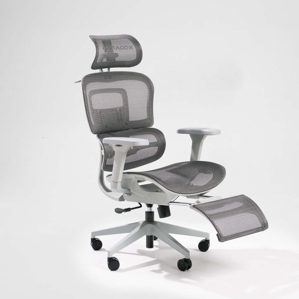 Modern grey that fits any office. Breathable mesh, 8+ adjustments, 4D arms, pull-out footrest, 135 kg, 100-day trial.