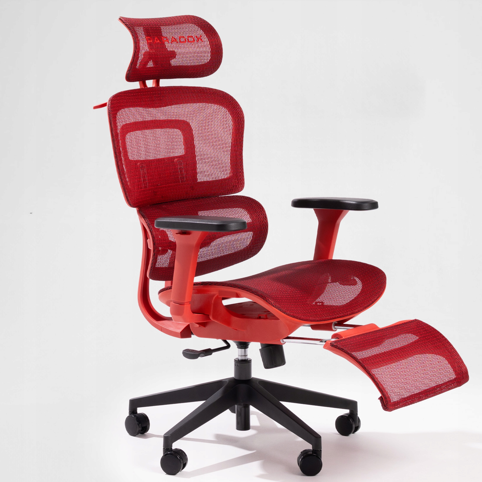 Red accent for a sharper desk setup. Breathable mesh, 8+ adjustments, 4D arms, pull-out footrest, 135 kg, 100-day trial.