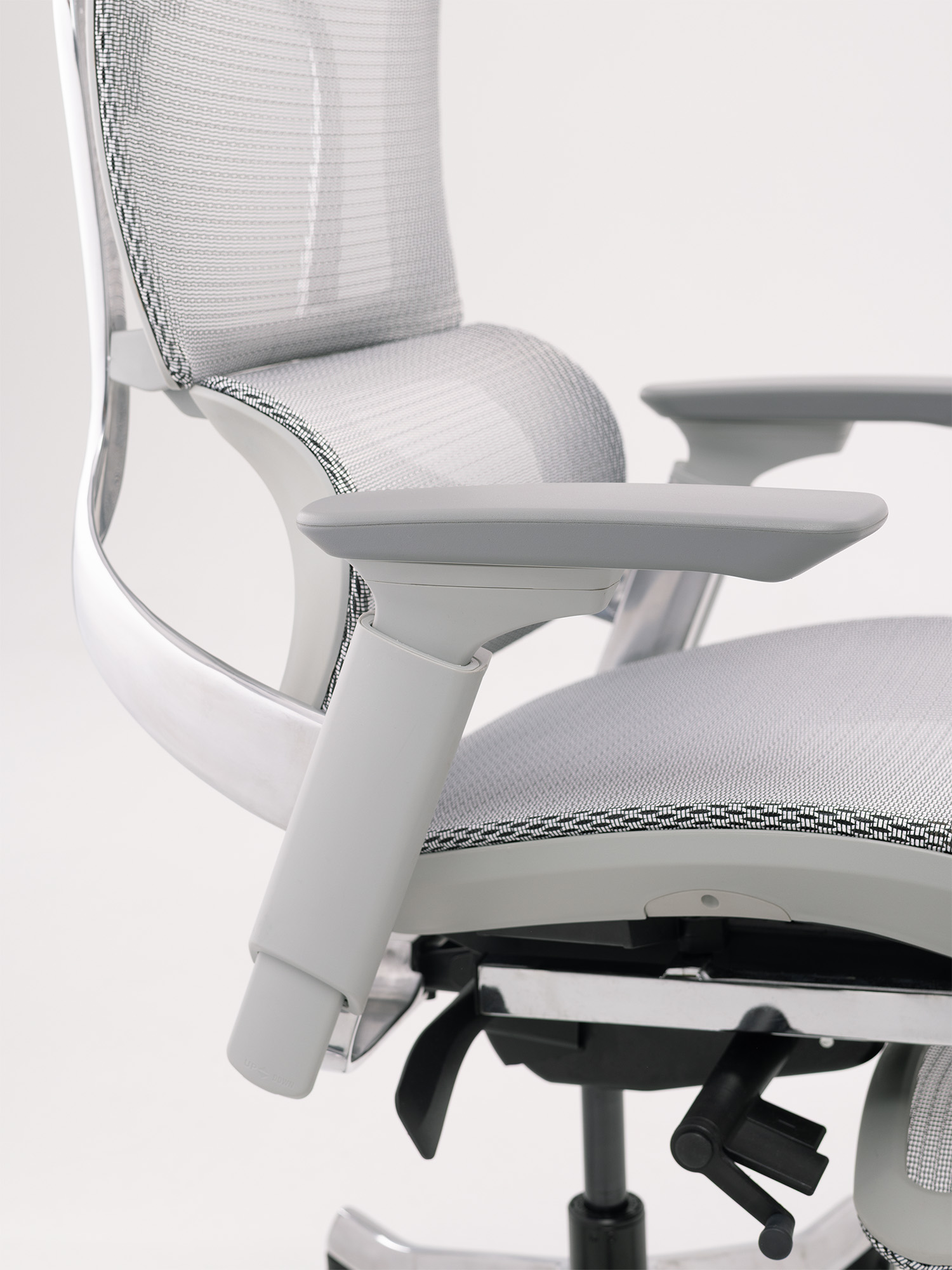 Height — aligns with desk surface for neutral shoulders. Width — accommodates different body sizes. Depth — forward for typing, back for mousing. Pivot — angled inward for keyboard work, outward for relaxed posture. Recline — armrests move with the backrest as you recline, maintaining optimal arm support in every position.