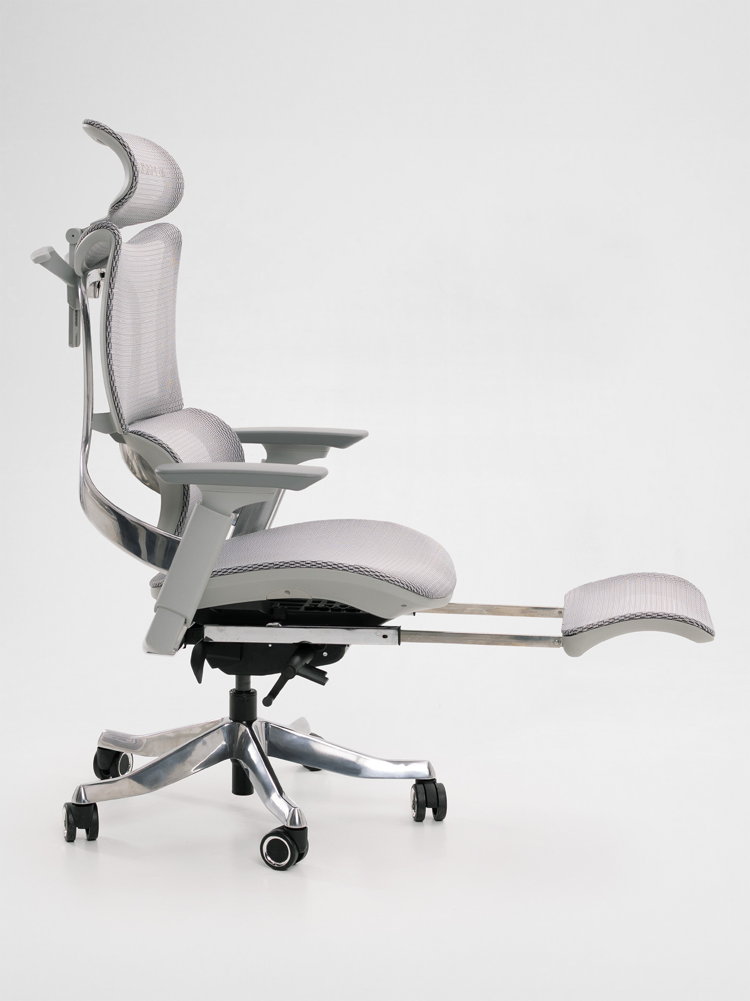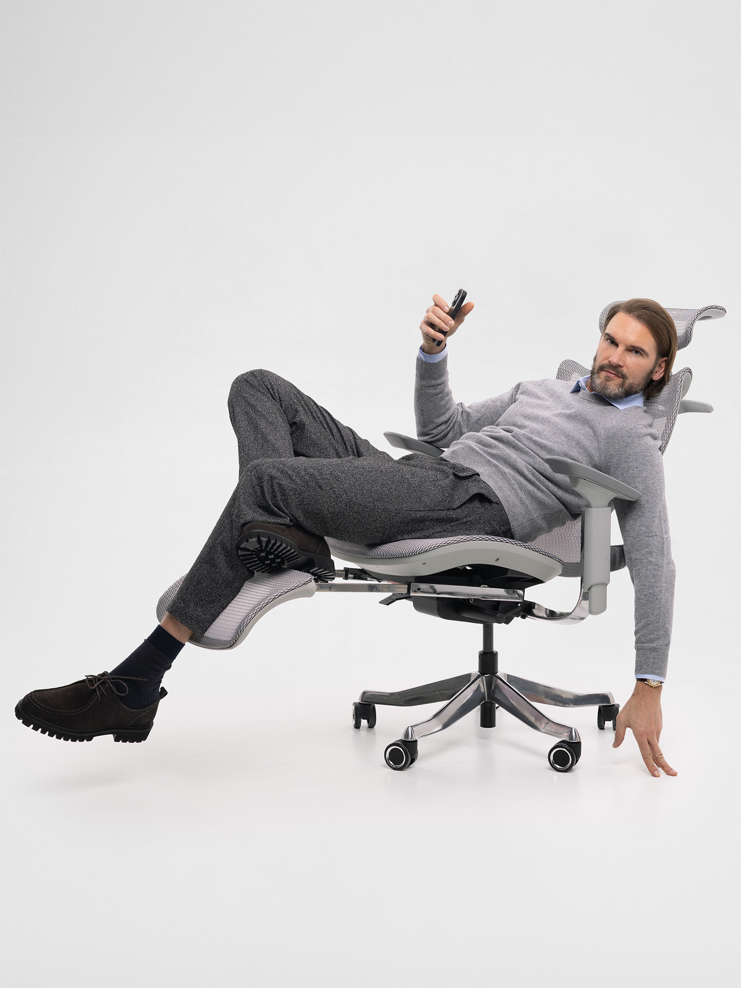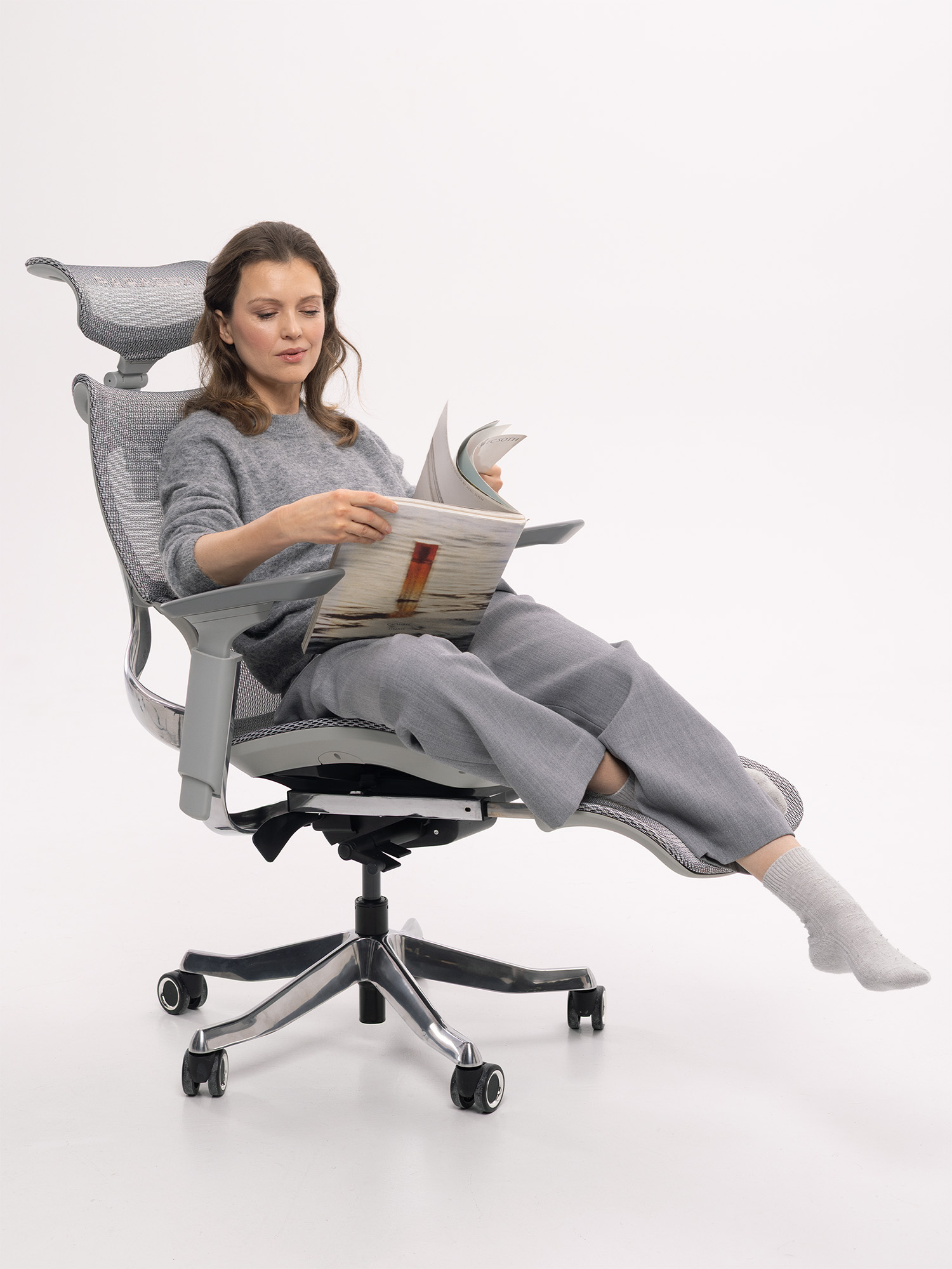 Dynamic positioning — 5D armrests + Donati synchro-tilt + extendable footrest allow seamless transitions between tasks: upright for deep work, reclined with footrest for recovery.