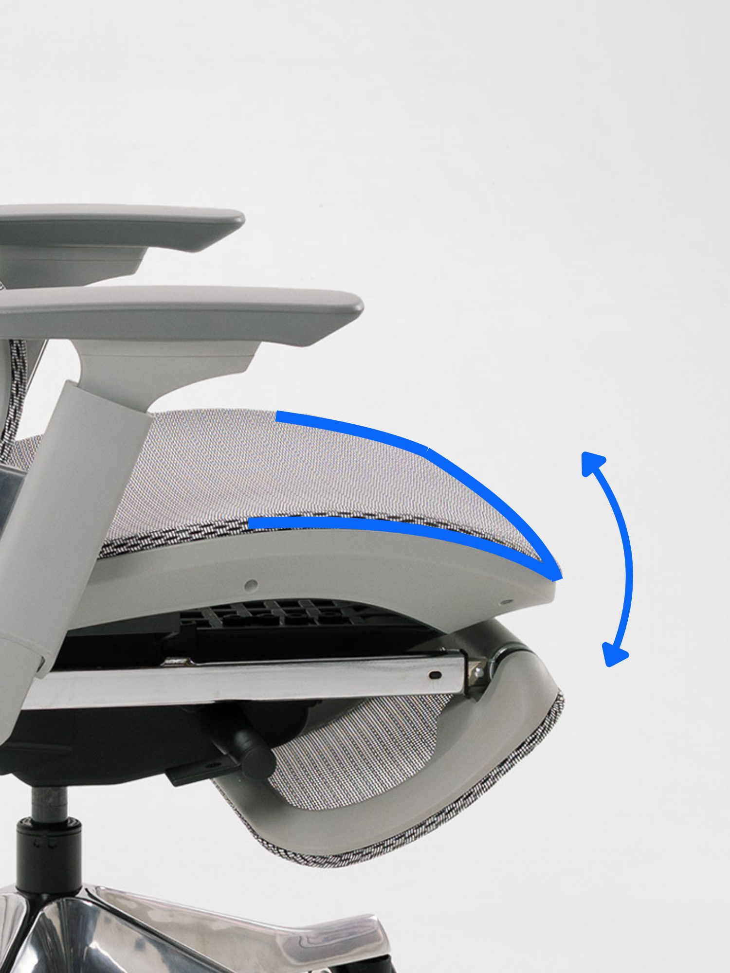 A subtlety most chairs ignore. Tilting the seat pan forward opens your hip angle beyond 90°, reducing lower back pressure and encouraging active sitting.